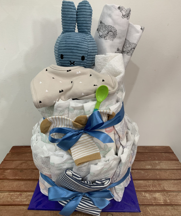 Presentation and practicability! Impressive tower of Huggies newborn Nappies covered with beautiful gifts and a premium miffy bear. Essentials for every new mum. Gift trinkets may include wraps, wipes, powder, soap, singlets, jumpsuits, dummies, socks.