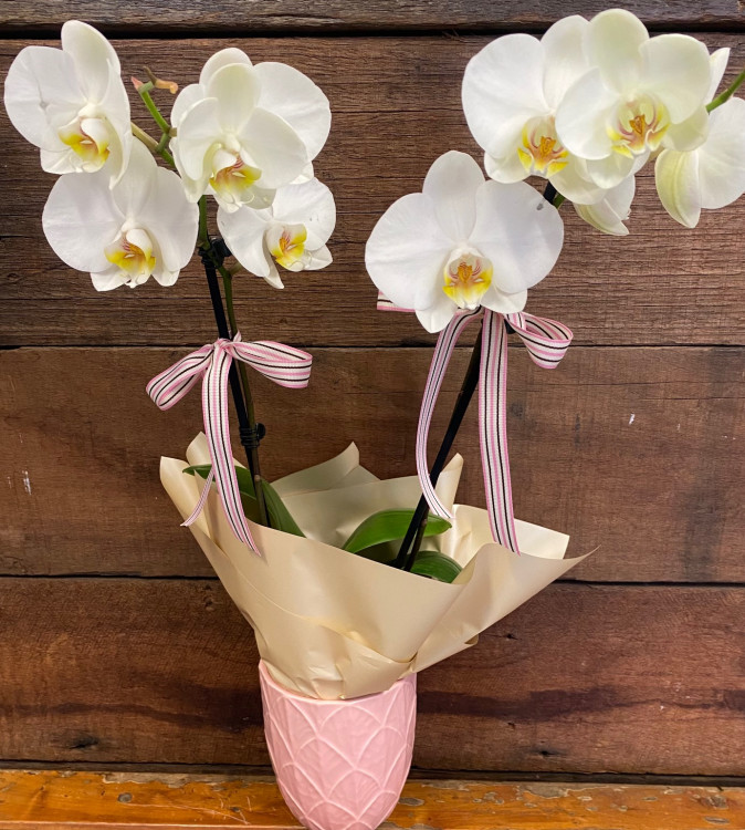 Stunning luxe phalaenopsis orchid plant in a ceramic pot. Colours may vary with availability on the day. Same day deliveries with orders placed by 12pm.