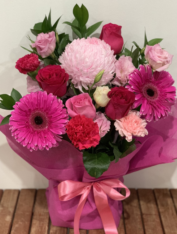 Hand gathered freshly cut flowers in pink tones from blush to deep pink. Quite traditional flower combination gift wrapped.