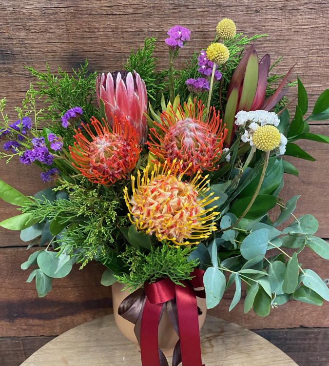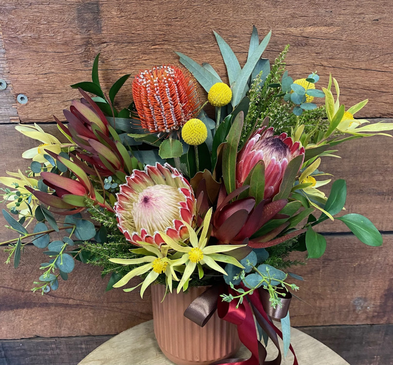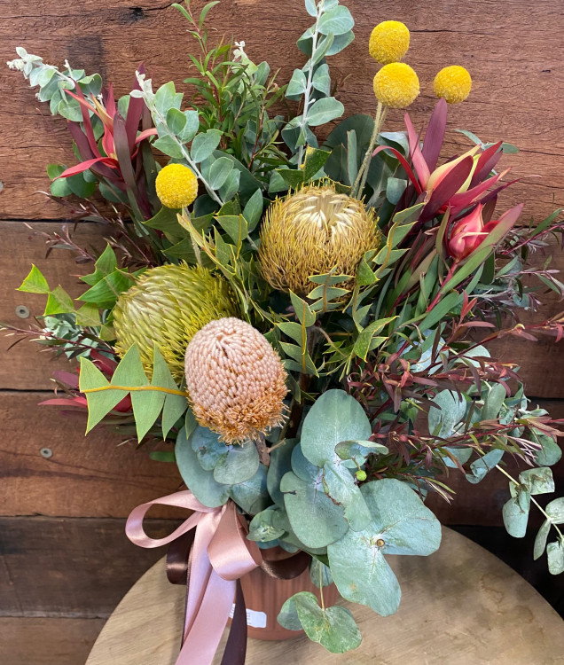 Stunning mixed native flowers and foliage's modernly presented in a mocha-coloured ceramic vase.