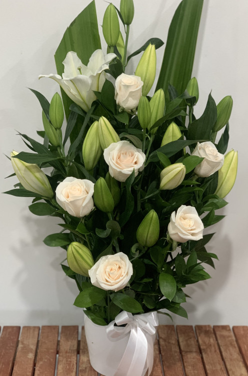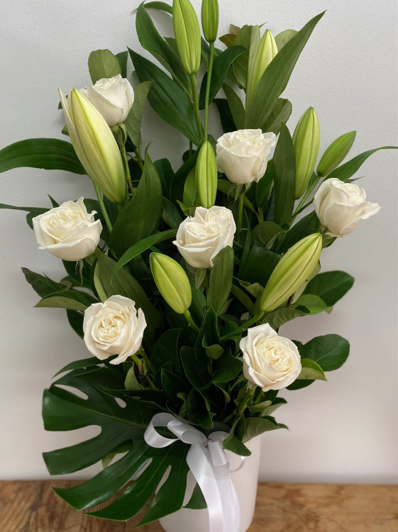 The crisp classic look of white premium flowers and lush green foliage. White oriental lilies and stunning white roses. Timeless.