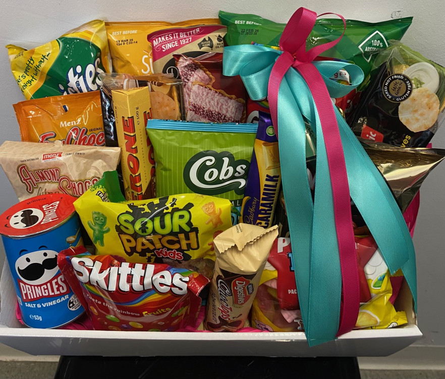 Purely designed for that one that loves to 'snack' A large hamper filled with all things sweet and savory! We all know someone that loves chocolate, potato chips, biscuits, nuts the list is endless. Suitable for any occasion. This will make someone smile.