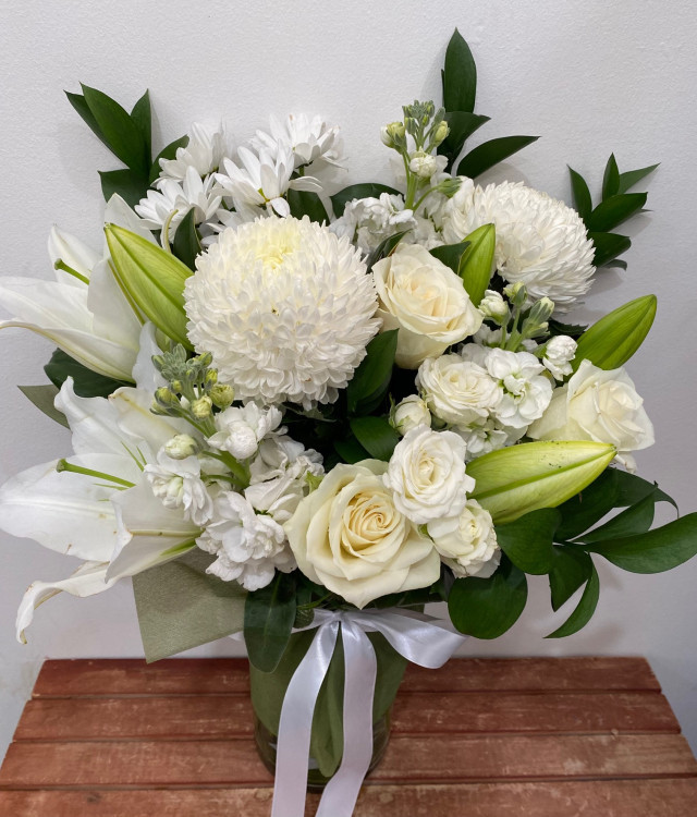 Timeless green and white flowers presented in a bouquet or in a vase.