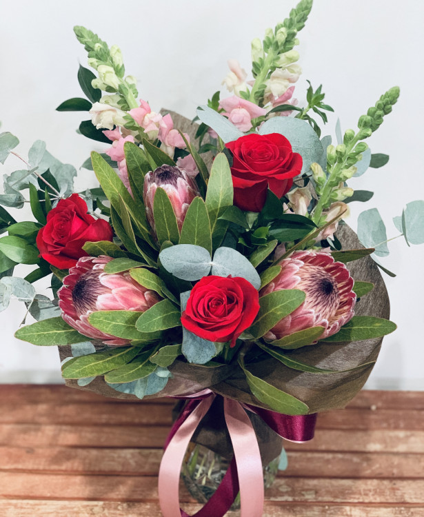 A loose Native feel with the elegance of red roses. Stunning reds and pinks with mixed foliage's presented in a bouquet or a vase with a deluxe ribbon. Flowers may vary with availability. Same day delivery with orders placed by 12pm.