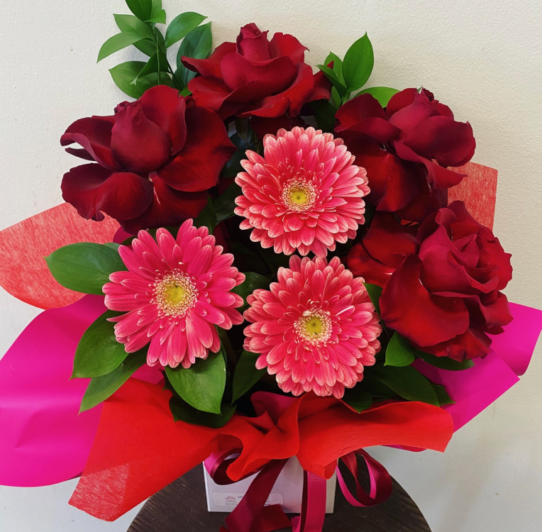 Reflexed roses paired with gerberas in the warm colours of red and hot pink. Designed with foliage and wrapped in luxe paper with a satin ribbon. Same day delivery with orders placed by 12pm.